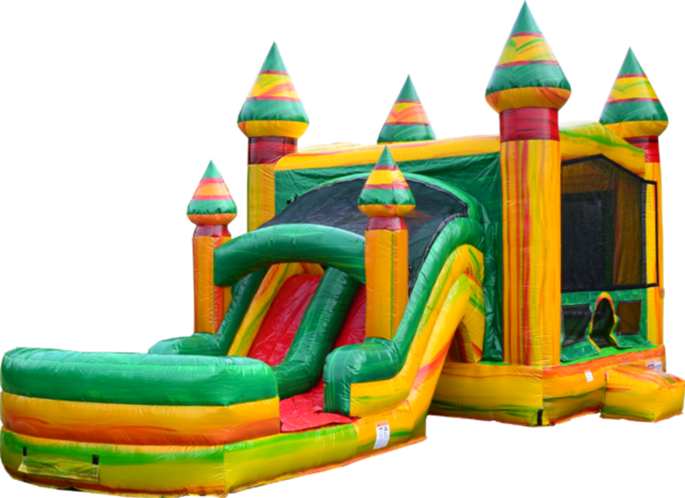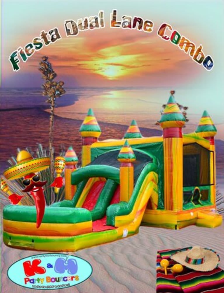 Let The Kids Loose to Have a Ball. Add a little spice to your FIESTA with Fiesta Dual Lane Combo. The Fiesta Dual Lane Combo features a large bounce area with a basketball hoop to keep the kids busy for hours. The kids can then cool down by simply climbing a wall that leads to dual slides. The kids can zoom down the slide and into a large splash landing area cooling down at the bottom of the slide.